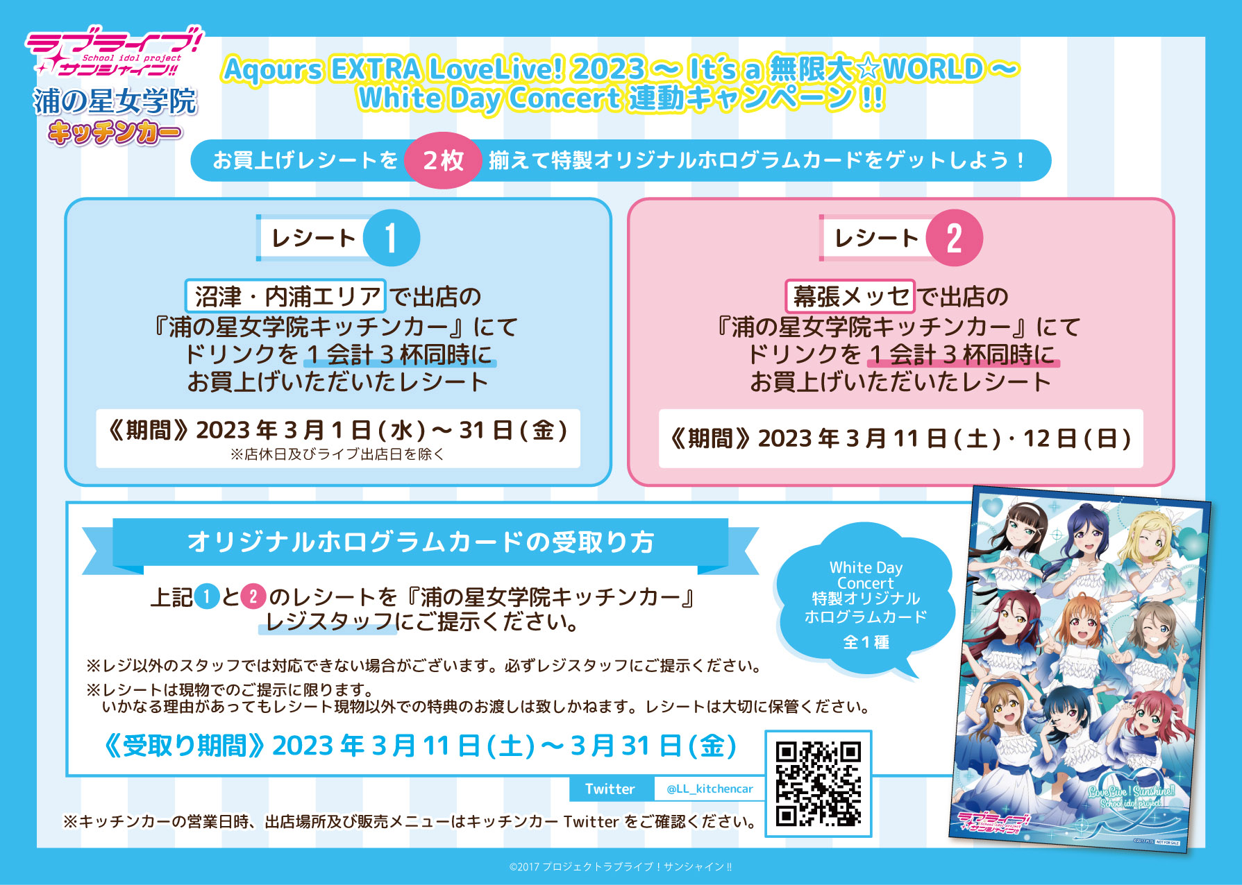 沼津・内浦エリアにて営業している浦の星女学院キッチンカーが、『ラブライブ!サンシャイン!! Aqours EXTRA LoveLive! 2023 ~It's a 無限大☆WORLD~<White Day Concert>』へ出店いたします!ライブ開催記念ドリンクの販売や、限定コースターのご用意もございますので、是非この機会にお立ち寄りください!