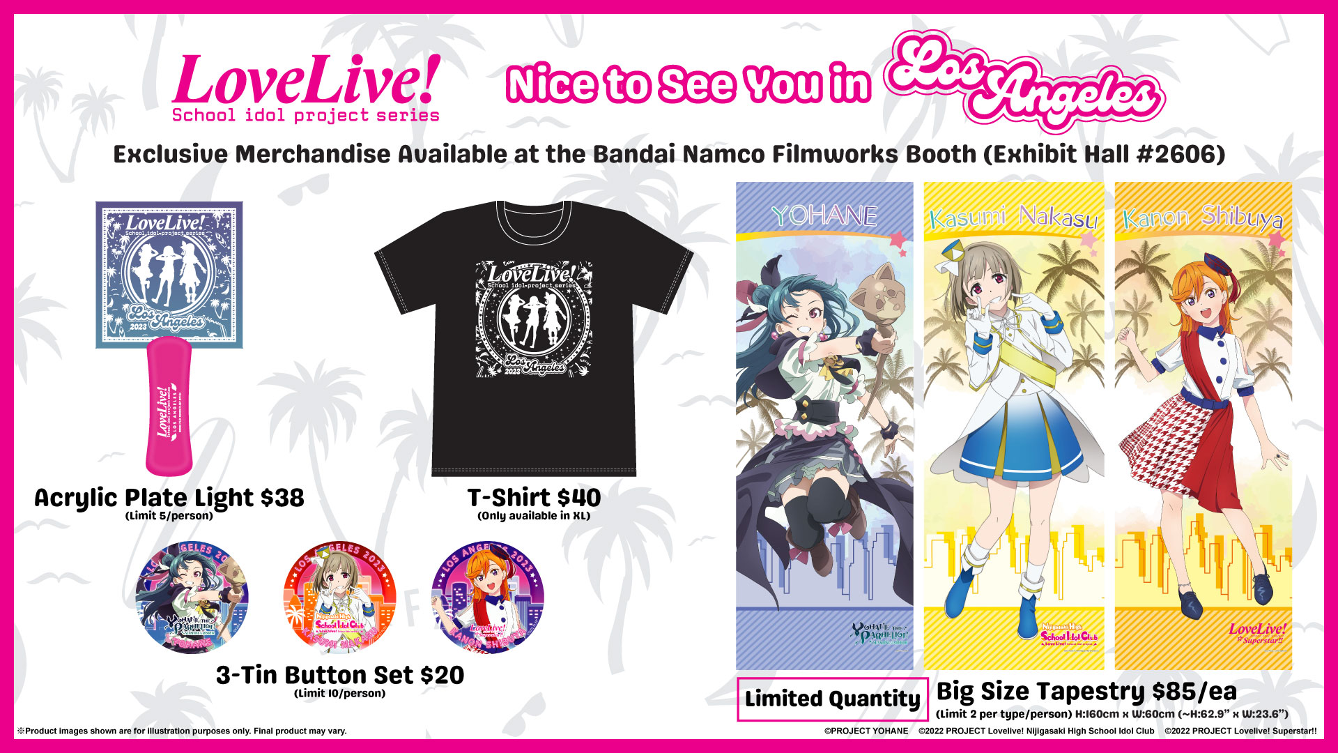 Aika Kobayashi, Mayu Sagara, and Sayuri Date will be hosting ticketed Special Meet and Greet sessions at the Bandai Namco Music Live booth (E-28) inside the Entertainment Hall on July 2! Get your tickets through purchasing the limited bundle set at the Bandai Namco Filmworks booth (Exhibit Hall #2606)!