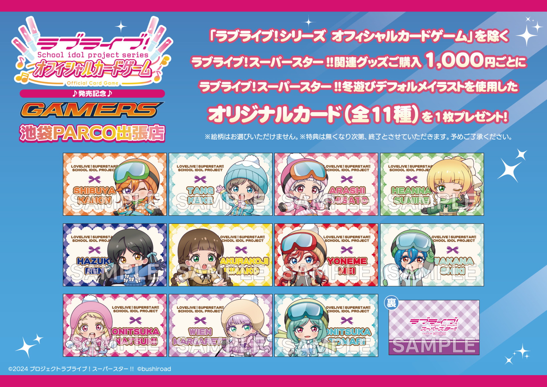 「ラブライブ!シリーズ オフィシャルカードゲーム」を除くラブライブ!シリーズ関連グッズご購入1,000円(税込)ごとにシリーズに応じた冬遊びデフォルメイラストを使用したオリジナルカードを1枚プレゼント!