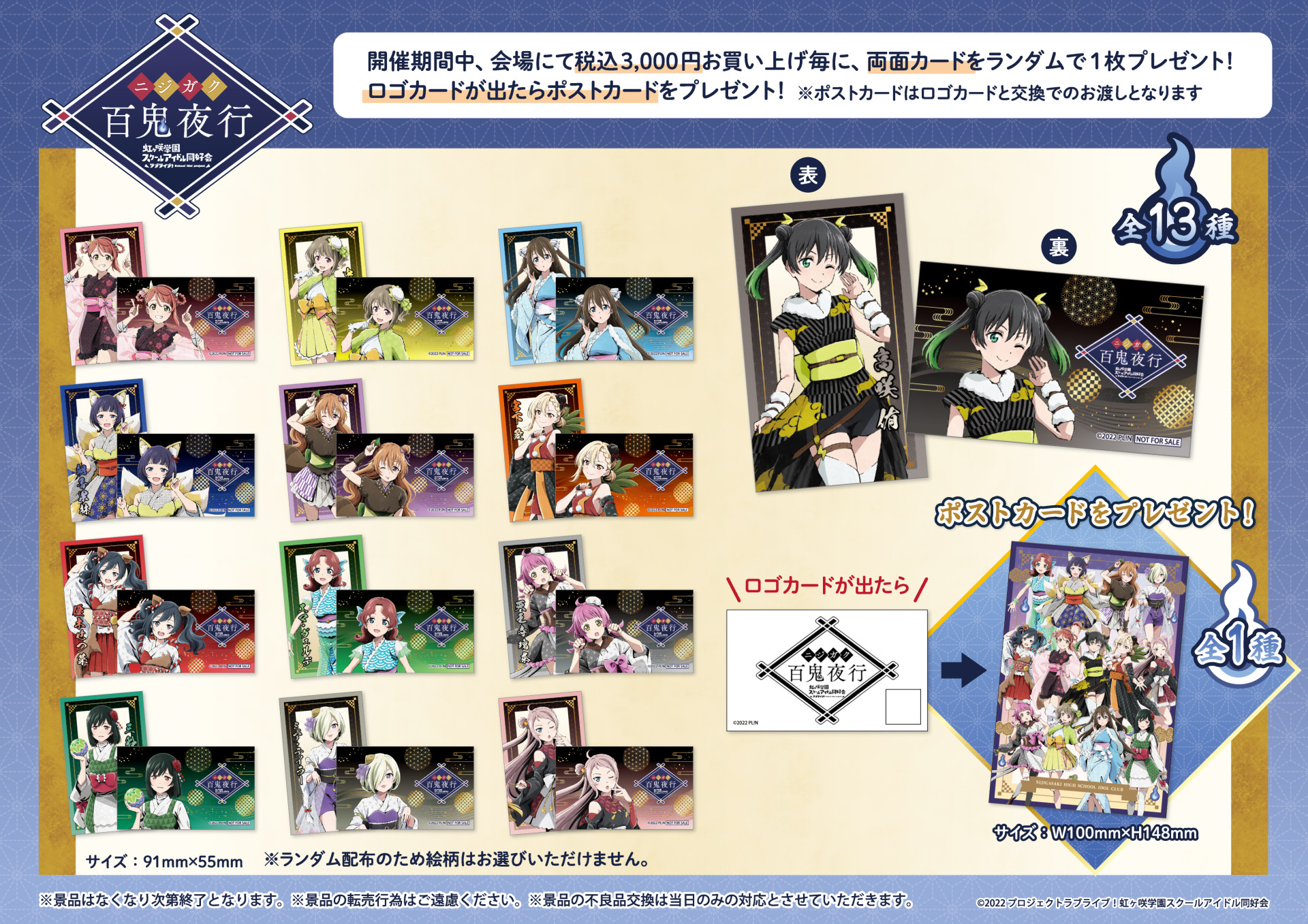 期間中、「ラブライブ!虹ヶ咲学園スクールアイドル同好会 POP UP SHOP」にて、税込3,000円お買い上げごとに、両面カード(全13種)をランダムで1枚プレゼント!また、ロゴカードが出たお客様には特製ポストカード(全1種)をプレゼントいたします!