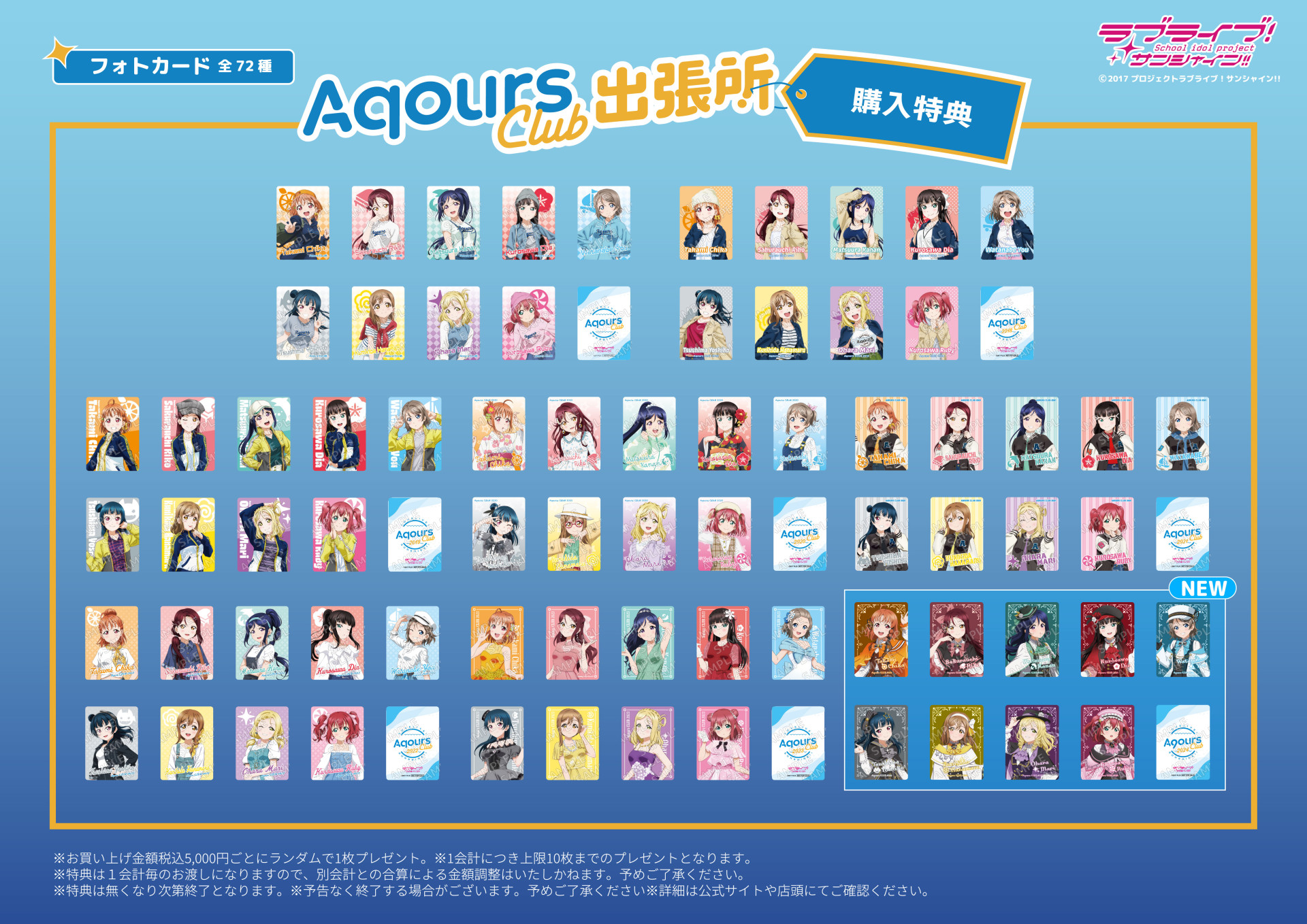 Aqours CLUB 出張所グッズを含むお買い上げ金額税込5,000円ごとにランダムで1枚プレゼント。