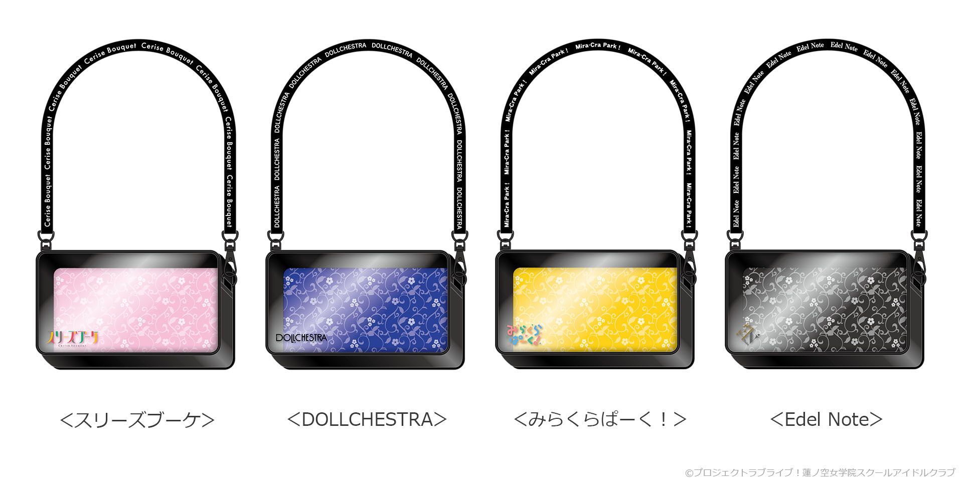 同時発売のショルダーポーチはぬいぐるみマスコットがぴったり入るサイズで、楽曲のライブ衣装をイメージしたデザインになっています。デザインは、「蓮ノ空女学院スクールアイドルクラブ」の4つのユニットにあわせて<スリーズブーケ>、<DOLLCHESTRA>、<みらくらぱーく!>、<Edel Note>の4種で展開します。