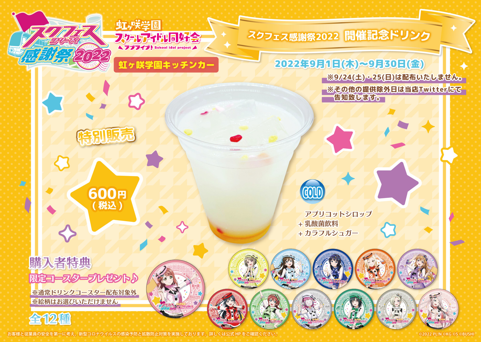 「ラブライブ!スクールアイドルフェスティバル ALL STARS キッチンカー at ODAIBAデックス東京ビーチ」「浦の星女学院キッチンカー」「虹ヶ咲学園キッチンカー」「結ヶ丘女子高等学校キッチンカー」より、スクフェス感謝祭2022の開催を記念した特別ドリンクが販売されます!